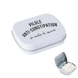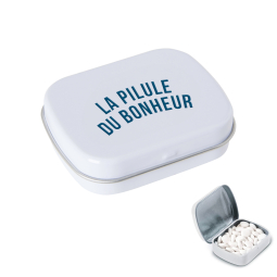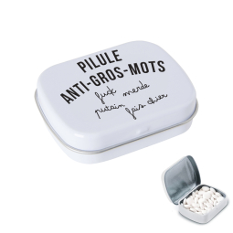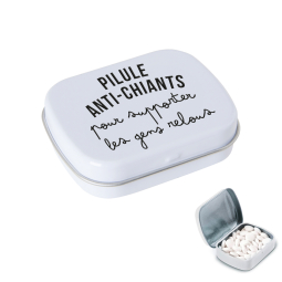 La boîte à bonbons "Pilule pour supporter les gens" est l’accessoire humoristique idéal pour garder le sourire en toutes circonstances. Fabriquée en métal blanc (6,2 x 1,5 x 5 cm), elle contient 23 g de bonbons à la menthe pour une haleine fraîche et des moments plus légers. À offrir ou à garder pour soi, cette boîte ajoute une touche d’autodérision à vos journées chargées.