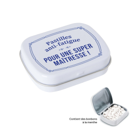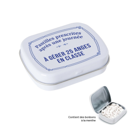 Boîte en métal blanc (6,2 x 1,5 x 5 cm) contenant 23 g de bonbons à la menthe. Une attention humoristique pour remercier les enseignants de leur patience.