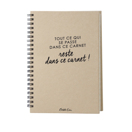 Carnet cartonné en kraft rigide, reliure en spirale, format A5 (15 × 21 cm). Pages lignées pour écrire facilement. Un carnet parfait pour noter tout ce qui se passe… ou tout ce que tu ne veux pas oublier.