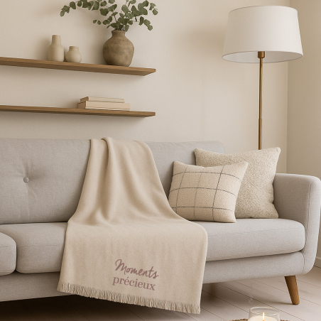 Plaid doux en coton 260 g/m², décoré en sérigraphie, dimensions 125 × 150 cm. Parfait pour envelopper vos plus beaux moments de douceur.