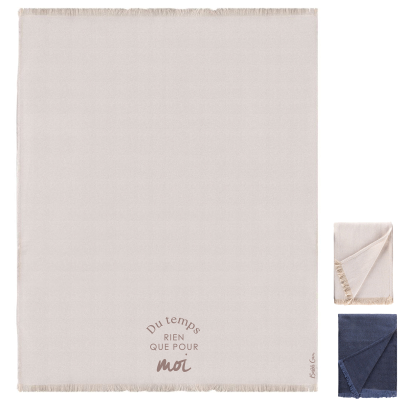 Plaid en coton 260 g/m², impression en sérigraphie, taille 125 × 150 cm. Un compagnon parfait pour des instants rien qu’à soi, confortables et apaisants.