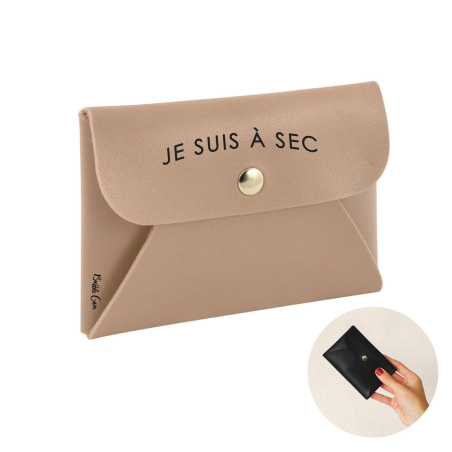 Porte-monnaie compact en similicuir sans PVC, système bouton pression, format 11,5 × 2 × 8 cm. Accessoire humoristique pour ceux qui sont “souvent à sec”.
