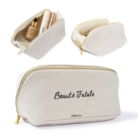 Trousse compacte en polyester 450 g/m², ultra douce, impression sérigraphie. Taille 18 × 9 × 9 cm. Conçue pour les beautés fatales.