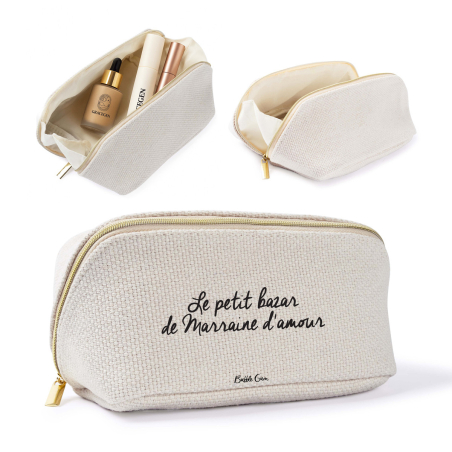 Trousse en polyester doux 450 g/m², avec impression sérigraphie. Dimensions : 18 × 9 × 9 cm. Un cadeau idéal pour une marraine attentionnée.
