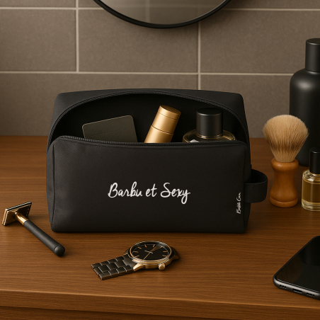 Trousse de toilette en PU/film 500 g/m², noire, robuste, avec poignée latérale et poche extérieure. Taille : 22 × 13 × 10 cm. Parfaite pour l’homme barbu et irrésistible.