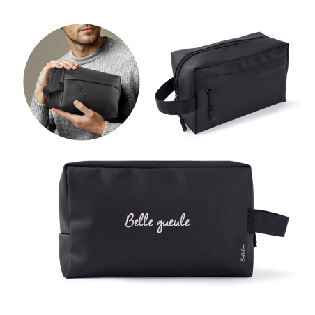 Trousse masculine en PU/film 500 g/m², noire, dotée d’une poignée latérale et d’une poche extérieure. Dimensions : 22 × 13 × 10 cm. Pour les hommes à la belle gueule.