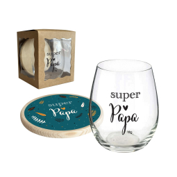 Ce coffret inclut un verre de 36 cl imprimé et un dessous de verre en bois assorti, portant le message "Super maman". Idéal pour des moments chaleureux en famille ou pour un cadeau unique. Dimensions : Verre (Ø8 cm, H10,3 cm), dessous (Ø10,3 cm).