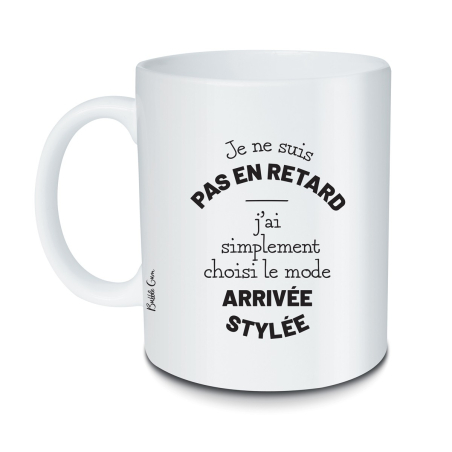 Le mug Je ne suis pas en retard apporte humour et légèreté aux matins pressés.