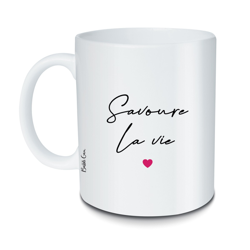 Le mug Savoure la vie inspire les petits bonheurs du quotidien. Cadeau positif et pas cher, fabriqué en France pour les amoureux de la vie.