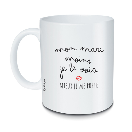 Le mug Mon mari moins je le vois mieux je me porte fait rire à coup sûr ! Cadeau pas cher et fun.