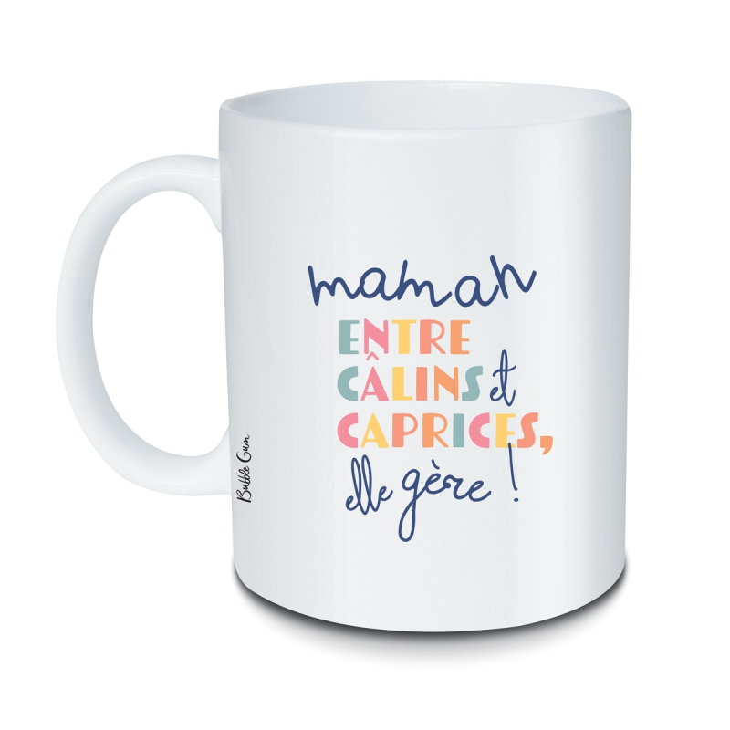 Le mug Maman entre câlins et caprices rend hommage aux mamans patientes et aimantes. Cadeau drôle, tendre et pas cher, conçu en France.