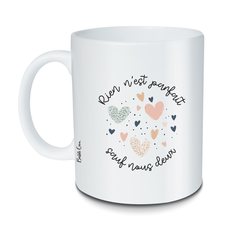 Le mug Rien n’est parfait sauf nous deux célèbre les couples imparfaits mais heureux. Cadeau romantique et original.