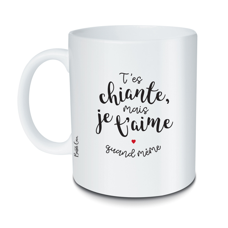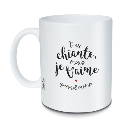 Le mug T’es chiante mais je t’aime, drôle et affectueux à la fois. Cadeau parfait pour une amoureuse unique.