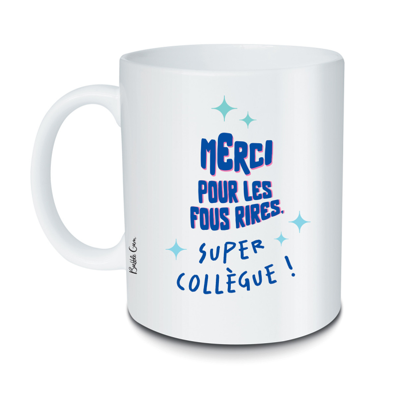 Le mug Merci pour les fous rires super collègue, une attention drôle et bienveillante. Cadeau parfait pour le bureau.