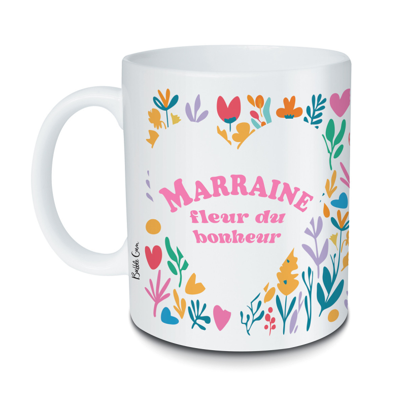 Le mug Marraine fleur du bonheur, tendre et joyeux, pour une marraine exceptionnelle.