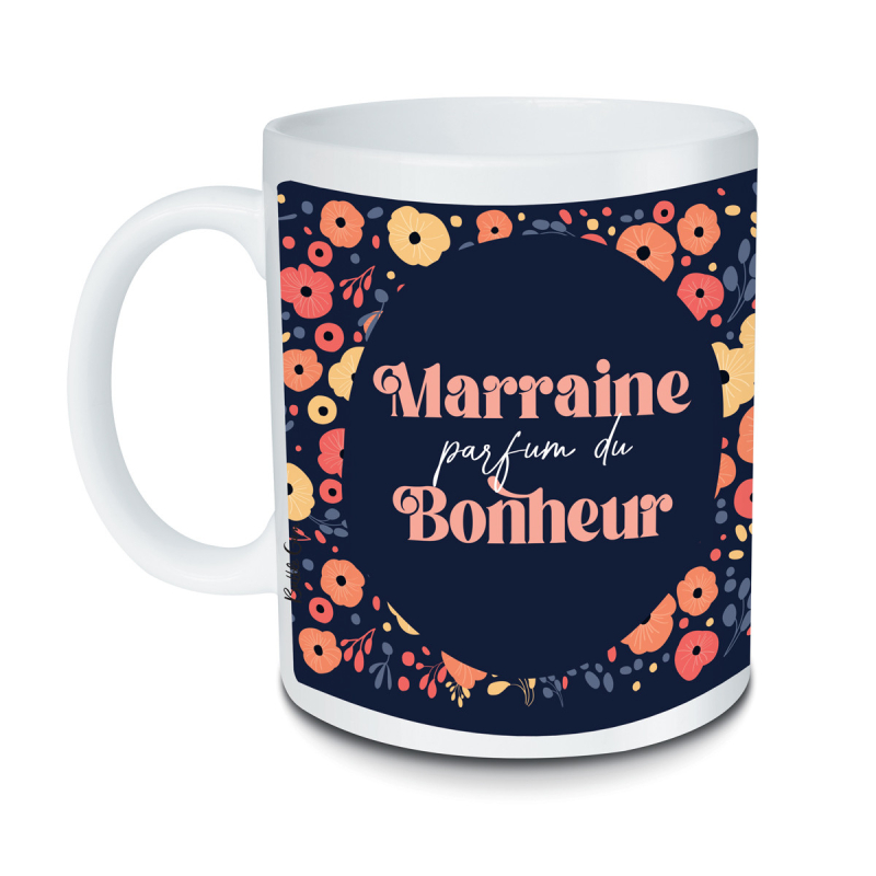 Le mug Marraine parfum du bonheur, un concentré de joie et de tendresse. Cadeau idéal pour marraine chérie.