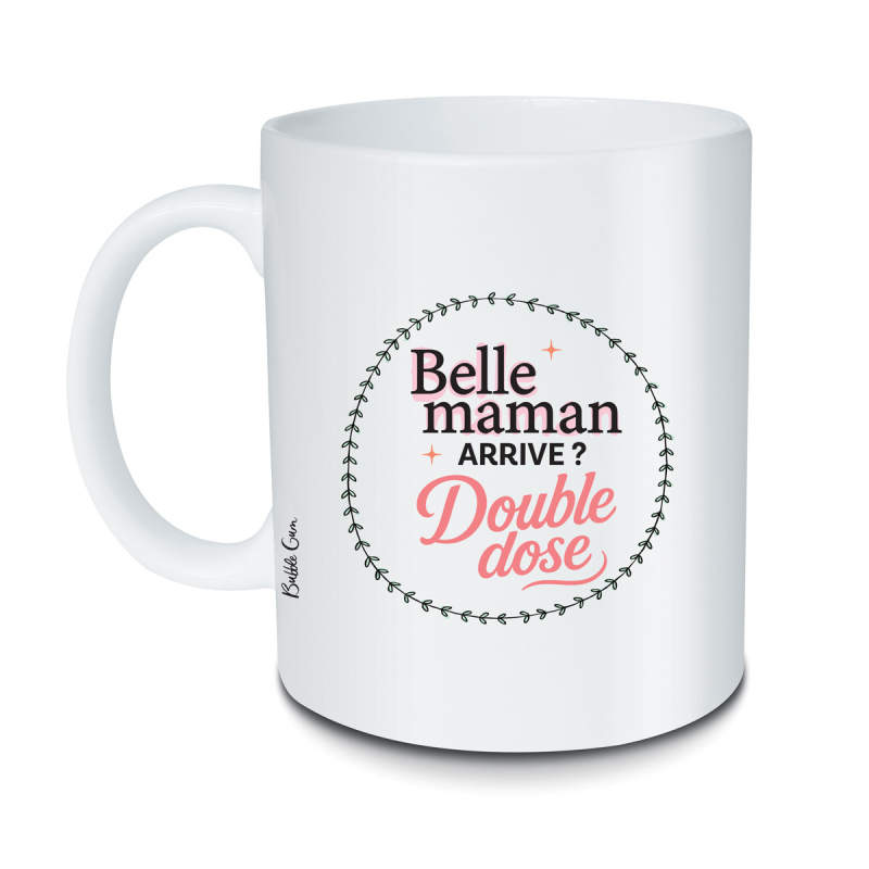 Le mug Belle maman arrive? Double dose, humour décapant pour dédramatiser les repas familiaux.