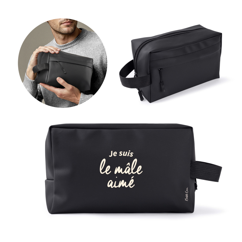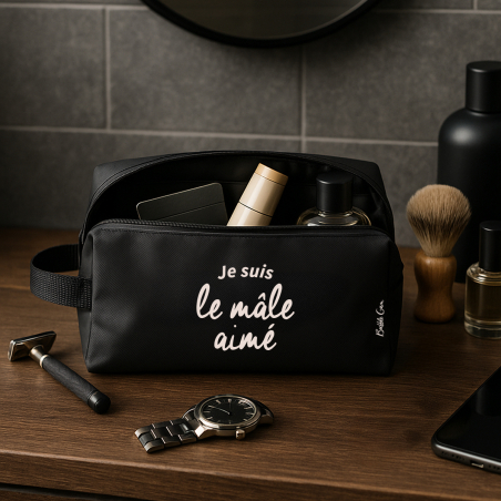 La trousse de toilette homme « Le mâle aimé » associe praticité et sens.