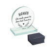 Trophée en verre transparent avec impression. Dimensions : 10 × 10 × 6,5 cm. Livré dans une boîte cadeau rigide. Un objet élégant pour célébrer une maman unique.