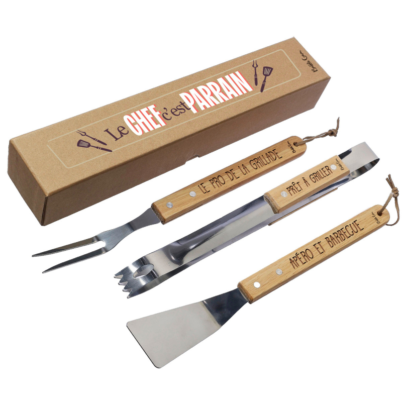 Parce qu’un parrain mérite aussi son titre de chef ! Le Set Barbecue - Le chef c’est parrain est un cadeau original et convivial. Caractéristiques : Set 3 pièces