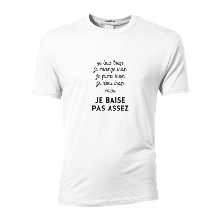 Un T-shirt humour assumé pour ceux qui aiment rire d’eux-mêmes. Cadeau parfait entre potes. Je bois trop mais je ne baise pas assez
