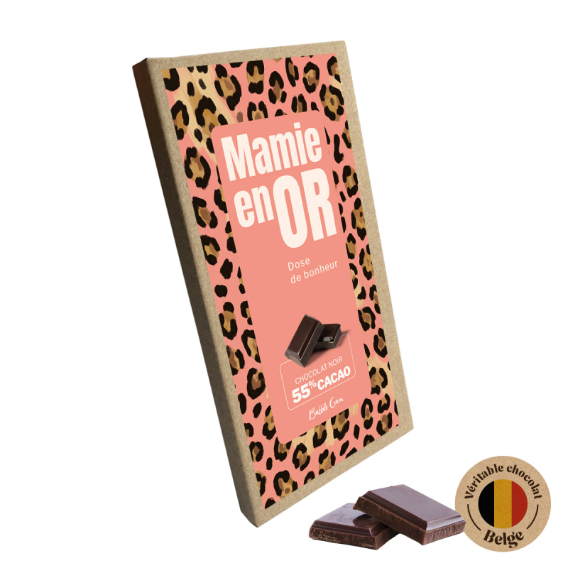 Parce qu’une mamie est un trésor… elle mérite une douceur à sa hauteur. La tablette de chocolat - Mamie en or - Dose de bonheur est une idée cadeau tendre et gourmande, parfaite pour lui faire plaisir. Elle contient 85 g de chocolat noir belge à 55% de cacao, fondant et savoureux, idéal pour un moment de plaisir. Son message affectueux en fait une attention pleine d’amour à offrir en toute occasion. Caractéristiques : Tablette de chocolat avec message tendre