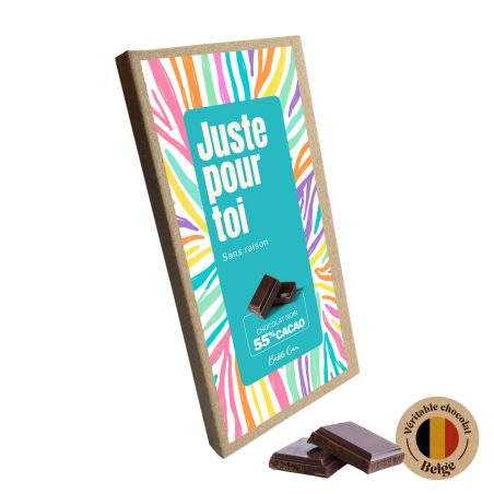 Pas besoin d’occasion pour faire plaisir. La tablette de chocolat - Juste pour toi - Sans raison est une attention spontanée, parfaite pour surprendre. Elle contient 85 g de chocolat noir belge à 55% de cacao, idéal pour un moment de douceur. Un cadeau simple… mais qui fait toute la différence. Caractéristiques : Tablette de chocolat avec message affectueux