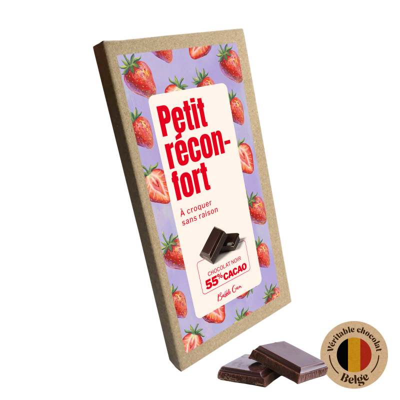 Parfois, il suffit d’un carré de chocolat pour aller mieux. La tablette de chocolat - Petit réconfort - À croquer sans raison est parfaite pour se faire plaisir à tout moment. Elle contient 85 g de chocolat noir belge à 55% de cacao, idéal pour une pause réconfortante. Un cadeau tendre et accessible. Caractéristiques : Tablette de chocolat avec message doux