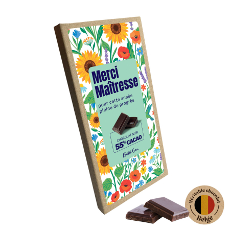 Une année riche en apprentissages mérite un joli merci. La tablette de chocolat - Merci maîtresse pour cette année est une idée cadeau parfaite pour la fin d’année scolaire. Elle contient 85 g de chocolat noir belge à 55% de cacao, pour offrir un moment de plaisir. Un cadeau simple, efficace et toujours apprécié. Caractéristiques : Tablette de chocolat avec message de remerciement