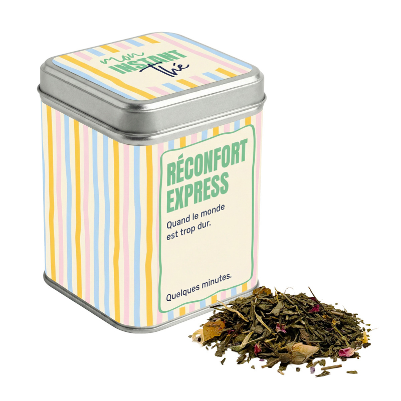 Certains jours, on a juste besoin de douceur et de réconfort immédiat. La boîte Mon instant thé - Réconfort express - Quand le monde est trop dur est là pour ça. Avec son message tendre et plein d’humour, elle apporte un peu de légèreté aux moments plus difficiles. Elle renferme 80 g de thé vert Sencha aux notes fruitées, parfait pour se recentrer et prendre soin de soi. Sa boîte en métal en fait un joli cadeau attentionné, à offrir ou à garder pour soi. Caractéristiques : Boîte en métal avec message humoristique