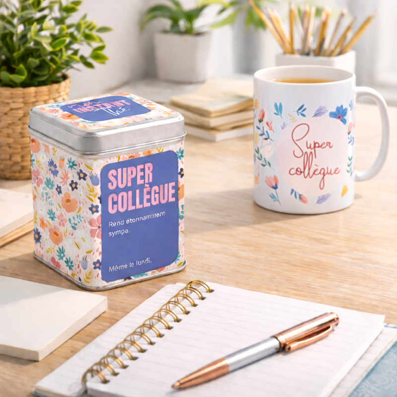 Parce qu’un super collègue mérite bien plus qu’un simple merci… La boîte Mon instant thé - Super collègue fleurs - Rend étonnamment sympa est une idée cadeau originale pour faire plaisir avec humour et douceur. Sa version fleurie apporte une touche élégante et chaleureuse. Elle contient 80 g de thé vert Sencha aux notes fruitées, parfait pour une pause agréable au bureau ou à la maison. Sa boîte en métal décorée en fait un cadeau attentionné, idéal pour marquer le coup avec légèreté. Caractéristiques : Boîte en métal avec message humoristique et motif fleuri