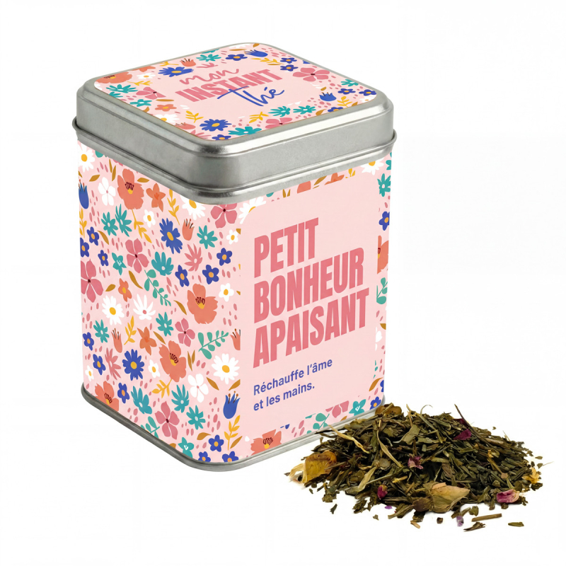 es petits bonheurs sont souvent les plus précieux. La boîte Mon instant thé - Petit bonheur apaisant - Réchauffe l’âme et les mains est une invitation à ralentir et à profiter de l’instant présent. Elle contient 80 g de thé vert Sencha aux notes fruitées, idéal pour un moment chaleureux et réconfortant. Sa boîte en métal en fait un cadeau parfait pour offrir un peu de douceur au quotidien. Caractéristiques : Boîte en métal avec message apaisant