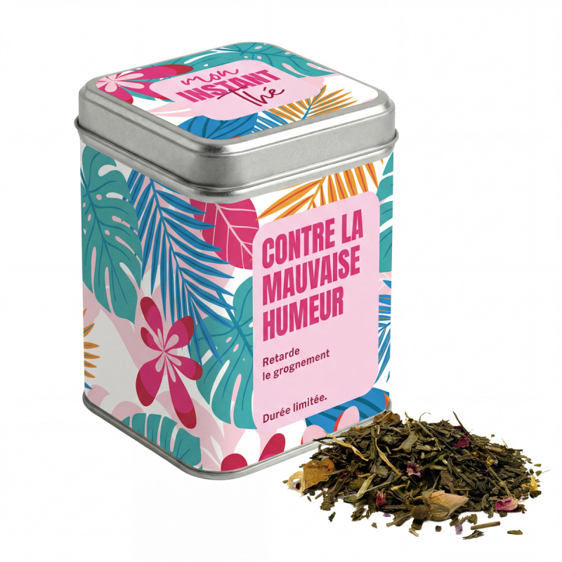 Les jours sans arrivent… mais ils passent mieux avec humour. La boîte Mon instant thé - Contre la mauvaise humeur - Retarde le grognement est parfaite pour apporter une touche de légèreté au quotidien. Elle contient 80 g de thé vert Sencha aux notes fruitées, idéal pour retrouver un peu de bonne humeur. Sa boîte en métal en fait un cadeau drôle et utile. Caractéristiques : Boîte en métal avec message humoristique
