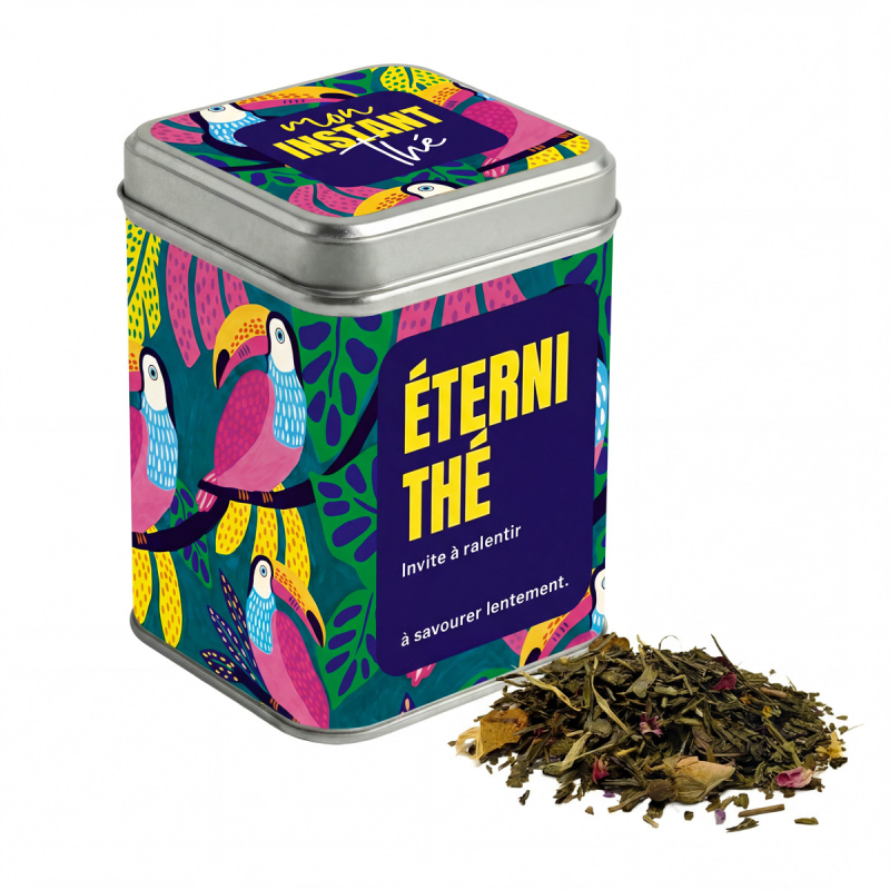 Et si vous ralentissiez vraiment ? La boîte Mon instant thé - Eternithé - Invite à ralentir est une invitation à profiter pleinement de chaque instant. Elle contient 80 g de thé vert Sencha aux notes fruitées, idéal pour une pause hors du temps. Sa boîte en métal en fait un objet à la fois esthétique et inspirant. Caractéristiques : Boîte en métal avec message inspirant
