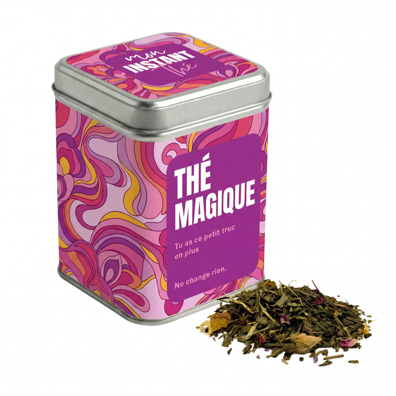 Parce que certaines personnes ont ce petit truc en plus qui fait toute la différence… La boîte Mon instant thé - Thé magique - Tu as ce petit truc en plus est une attention originale pour leur faire plaisir. Elle contient 80 g de thé vert Sencha aux notes fruitées, idéal pour accompagner ces moments précieux. Sa boîte en métal en fait un cadeau touchant et mémorable. Caractéristiques : Boîte en métal avec message valorisant