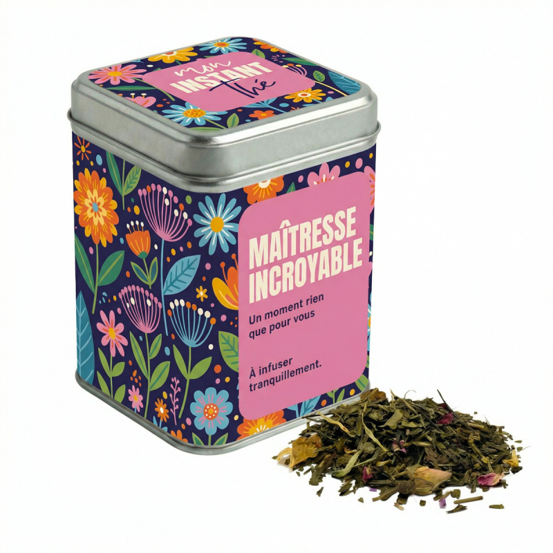 Après une année bien remplie, il est temps de dire merci avec une attention pleine de douceur. La boîte Mon instant thé - Maîtresse incroyable - Un moment rien que pour vous est idéale pour offrir un instant de calme et de plaisir à une maîtresse dévouée. Elle contient 80 g de thé vert Sencha aux notes fruitées, parfait pour une pause détente bien méritée. Sa boîte en métal en fait un joli souvenir à conserver, aussi utile qu’émotionnel. Caractéristiques : Boîte en métal avec message de remerciement